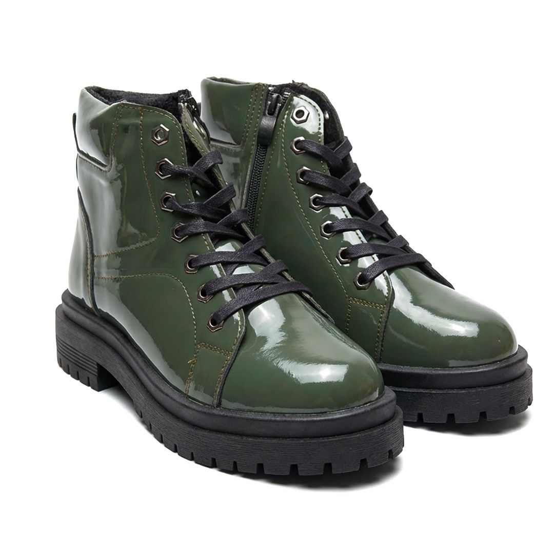 Stay unstoppable with these water-resistant, glossy combat boots designed for bold everyday wear.
